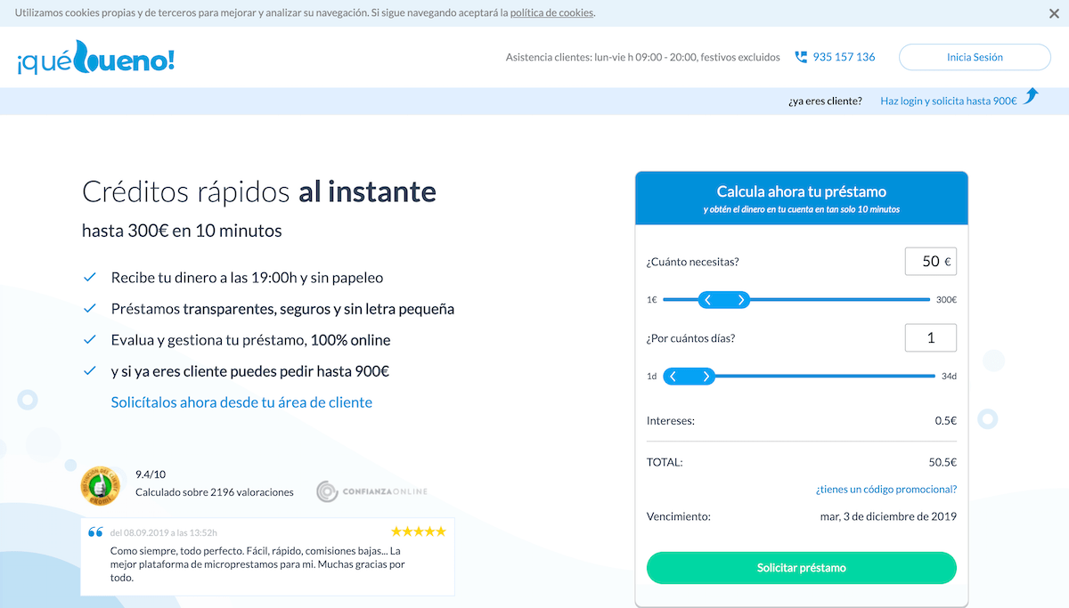 QueBueno, que es un sitio web que puede encontrarse referenciado en gran cantidad de comparadores de préstamos, cuenta con un sistema que compara, evalúa y escoge entre todos los clientes. En QueBueno tu crédito puede ser aprobado en cuestión de minutos en cualquier lugar de España. Adicionalmente, gracias a su página web podras encontrar directamente toda la información que necesitas y las condiciones completas sobre las que estarás solicitando el préstamo. Por esta razón podemos asegurarte que su sistema es tremendamente eficaz, veloz y sobre todo confiable.